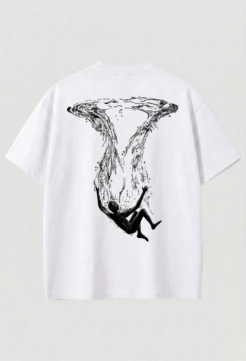 Stand out with this premium white graphic t-shirt featuring a unique abstract artwork of a falling figure blended with fluid water-inspired design. This artistic and minimal print gives a deep, modern aesthetic—perfect for those who prefer meaningful and creative fashion.